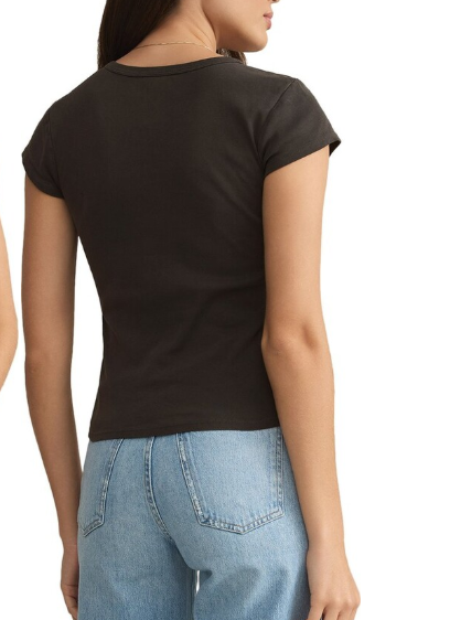 Washed black denim with a chic cap sleeve. Fitted tee. Sizes S-L