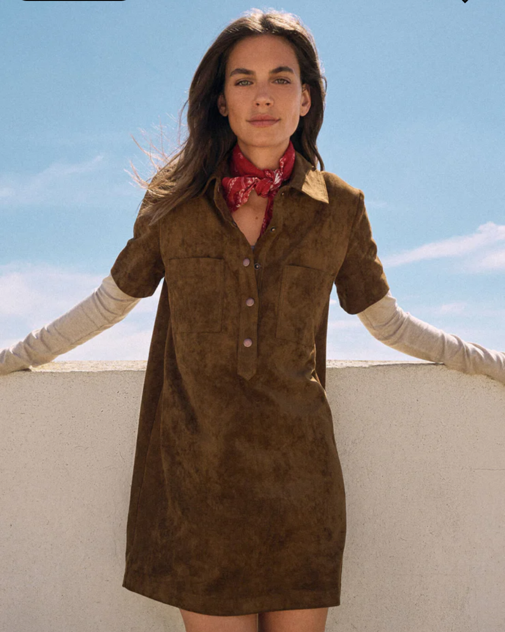 All the polish and comfort of a shirt dress, now in seasonal suede. Fully lined with patch pockets and metal shank buttons. Fits true to size. S-L